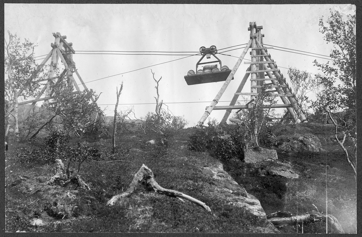 Titel: Ofotenbanan. Linbana vid Hunddalen för transport av förnödenheter järnvägsbyggnaden.