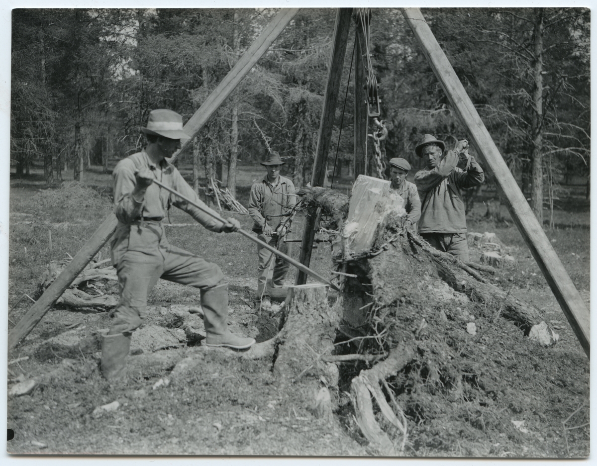 Arbetslag sysselsatta med stubb brytning (upptagende och bortforsling av trädstubbar) under arbetet med anläggningen av Inlandsbanan.