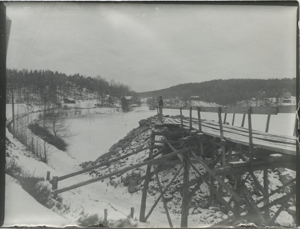 Dubbelspårsbanbyggnad Göteborg - Alingsås, år 1911 - 1916. Bilden visar påbörjad utfyllnad för ny banvall i sjön Lillelången. Detta i samband med linjerätning vid Norsesund.