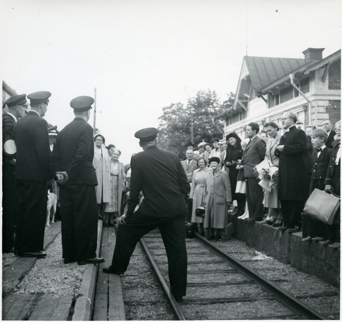 Titel: Prosten Lundgren håller "avskedssgudstjänst" vid Karmansbo station.