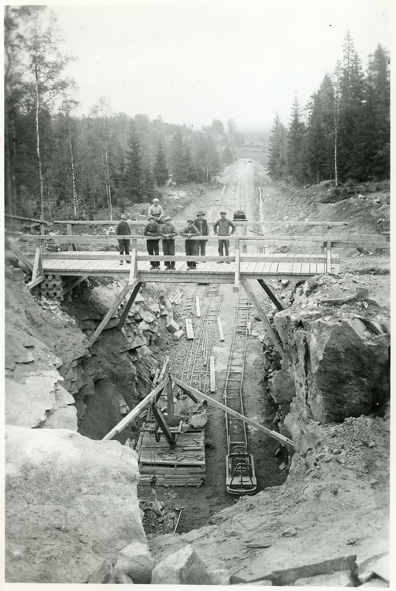 Bergskärning med provisorisk bro vid 25/100. Rallare. Decauvillespår, de färdiga rälslängder användes som provisoriska banor för banarbetsfordon.