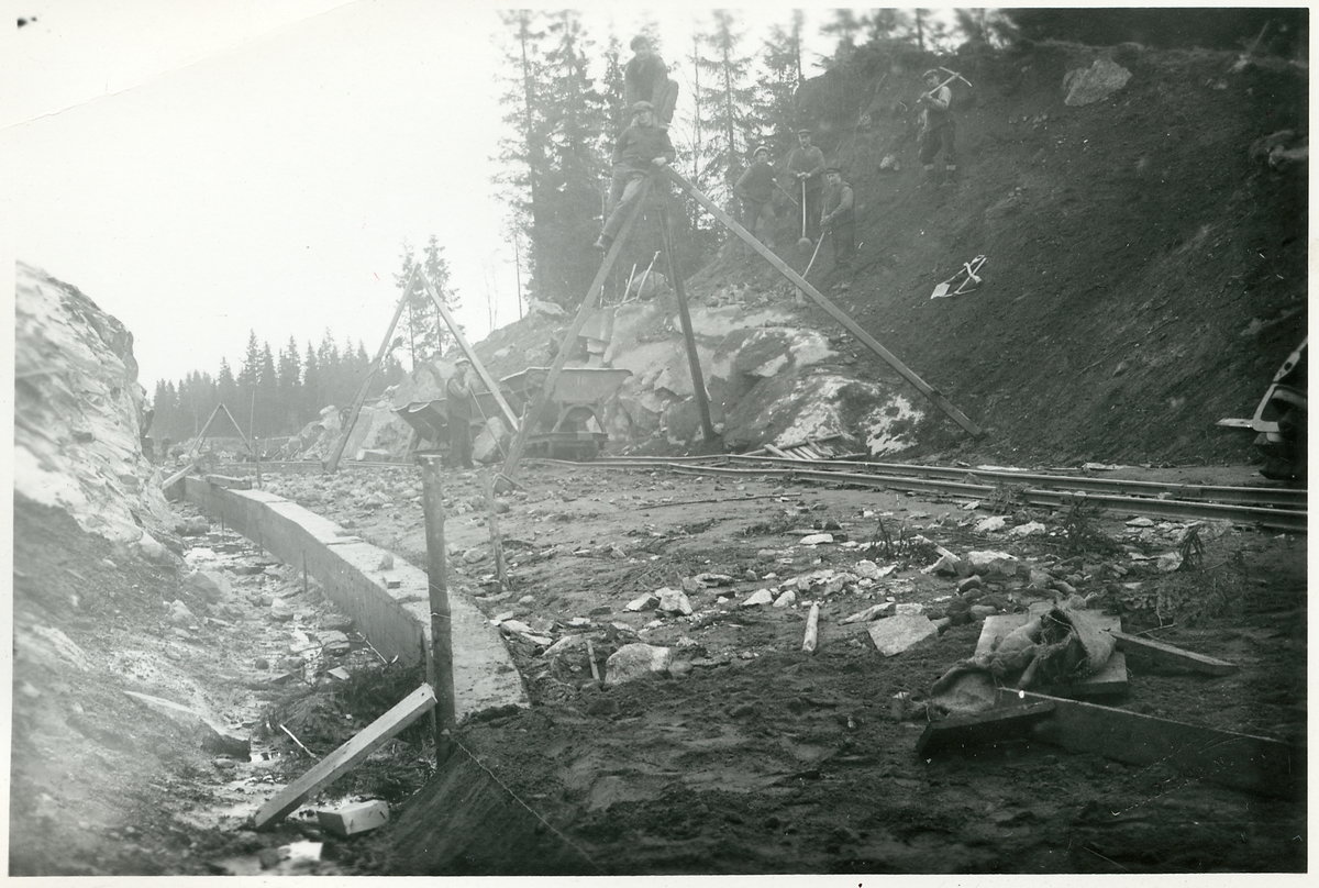 Bergskärning vid Pinebo station. Decauvillespår, de färdiga rälslängder användes som provisoriska banor för banarbetsfordon.