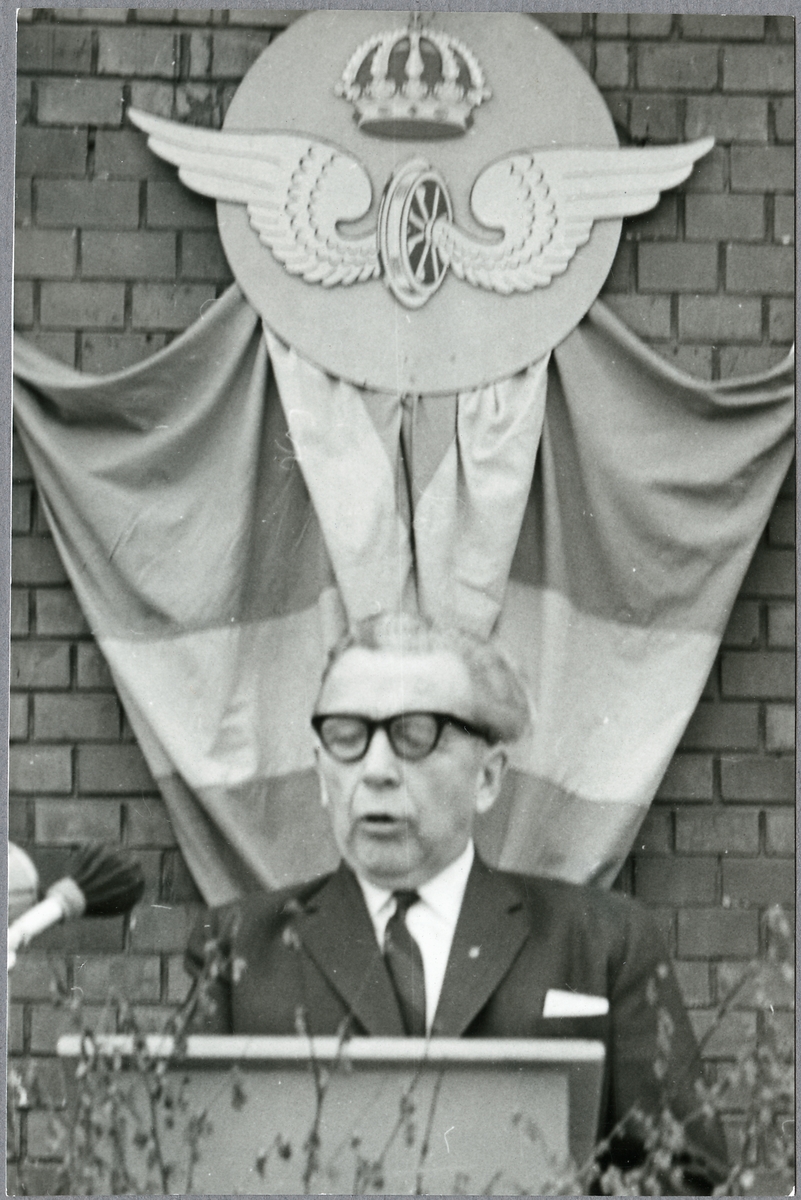 Titel: Statsrådet Gösta Skoglund håller invigningstal under SJ-emblemet på Borås Central.