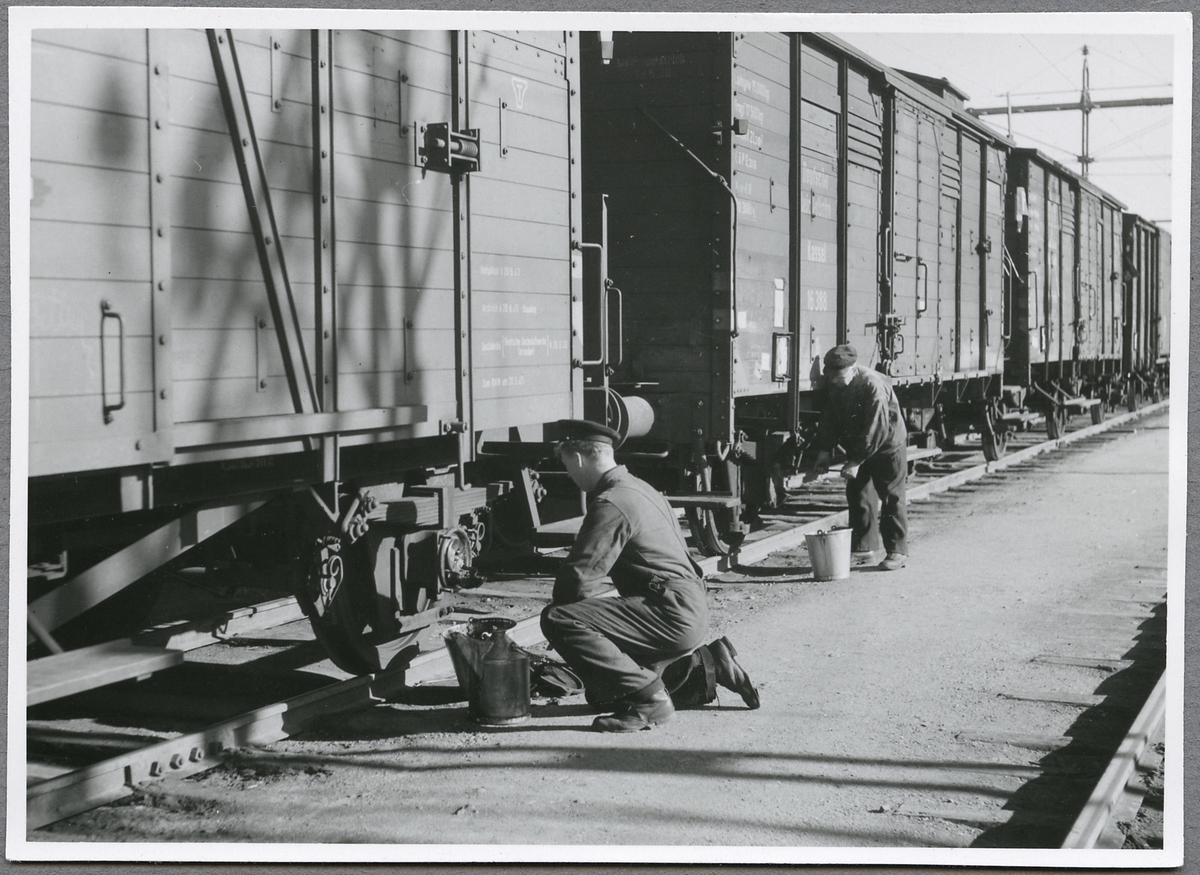 Personal vid tysk godsvagn. Tysk godsvagn Deutsche Reiscbahn, DRB Kassel 16 388.