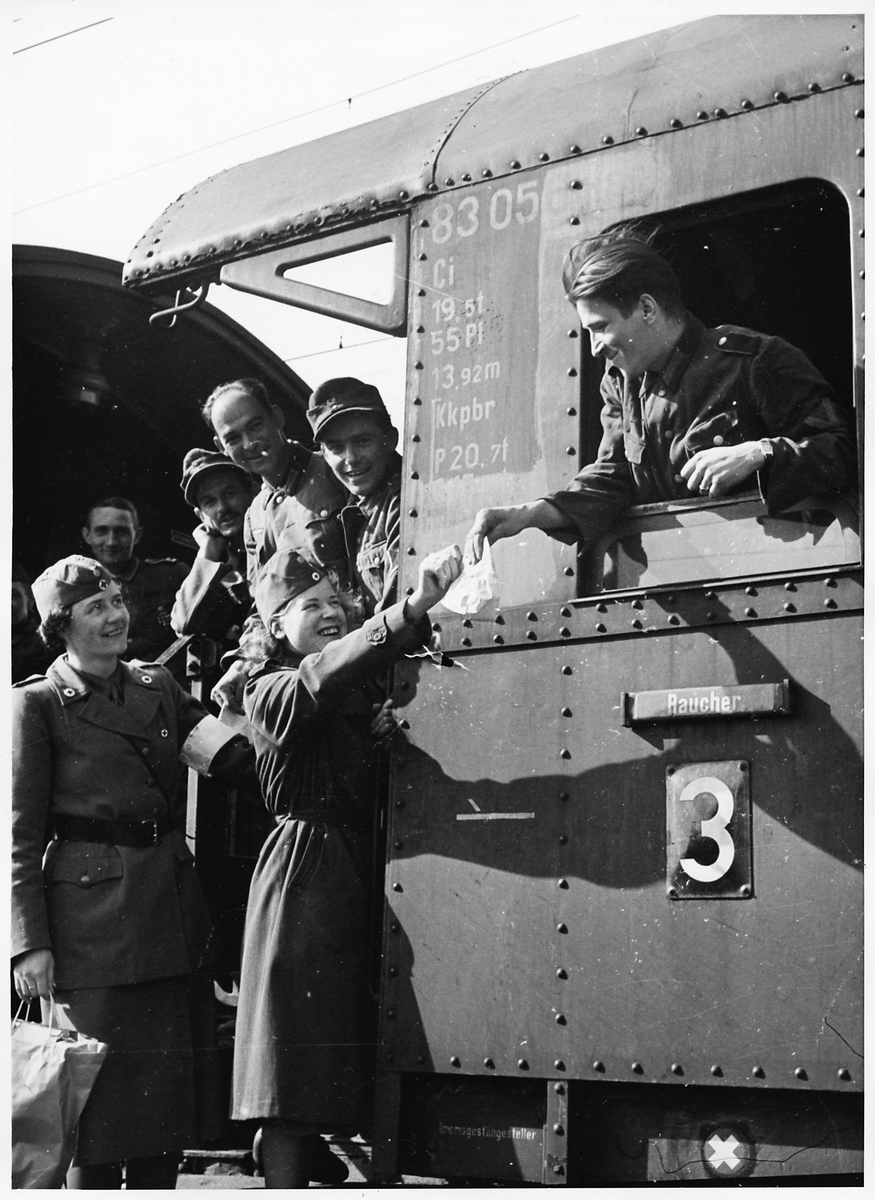 Röda korssystrar besöker skadade tyska soldater som är ombord på ett tyskt sjukvårdståg i Hallsberg under Andra Världskriget.