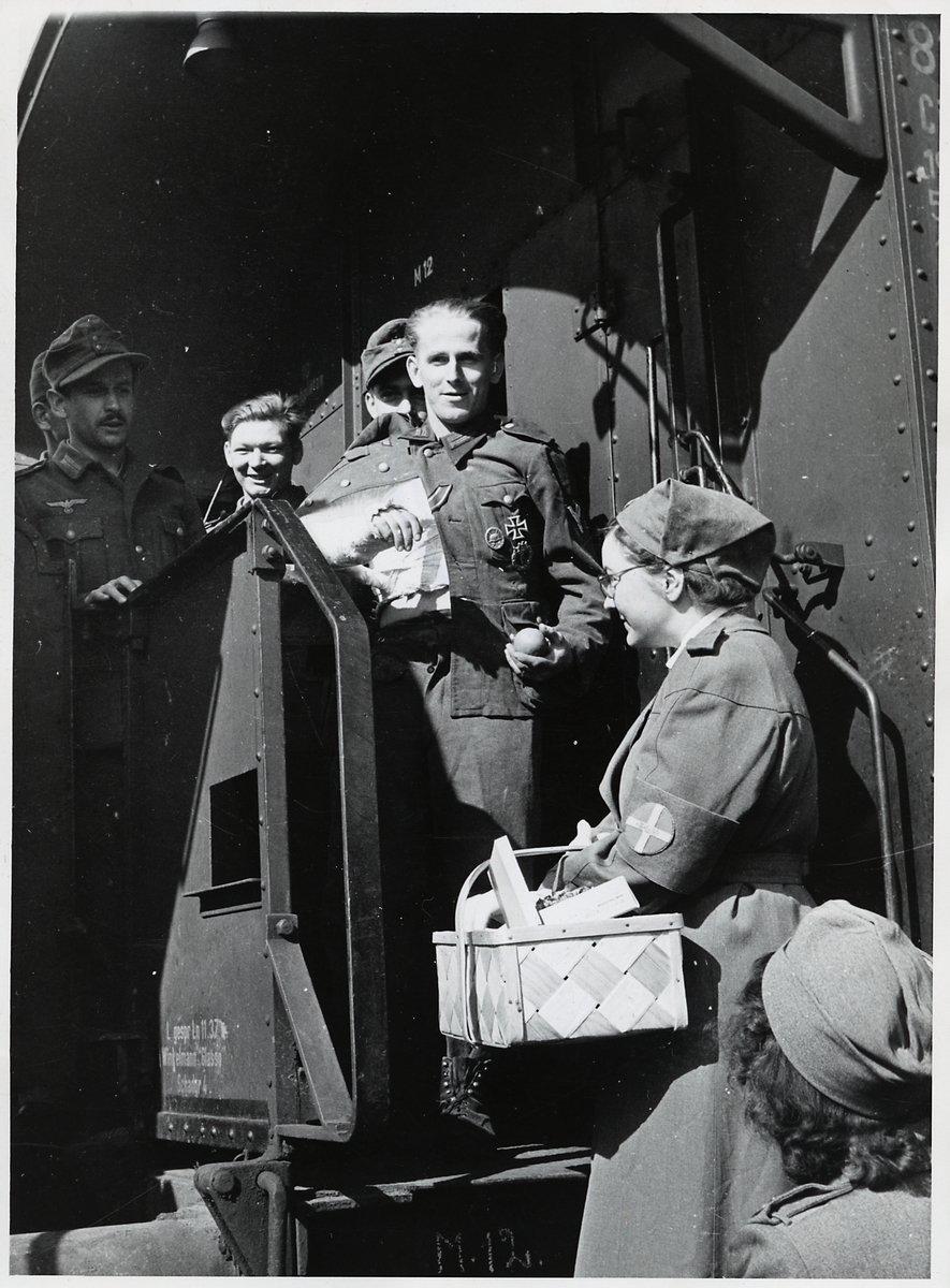 Medlemmar ur Lottakåren besöker skadade tyska soldater ombord på ett tyskt sjukvårdståg i Hallsberg under Andra Världskriget.