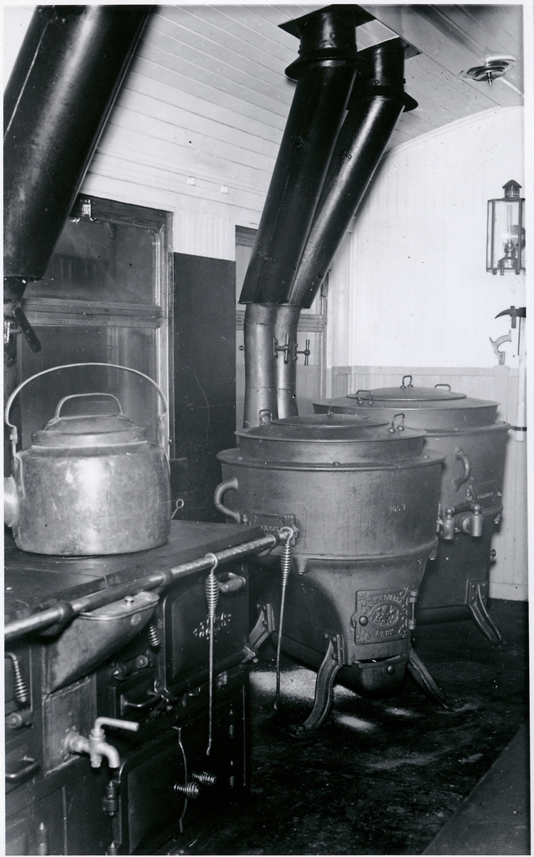 Titel: Interiör från utställningståget "SJ i försvarets tjänst". Köksvagn i sjukhuståg.