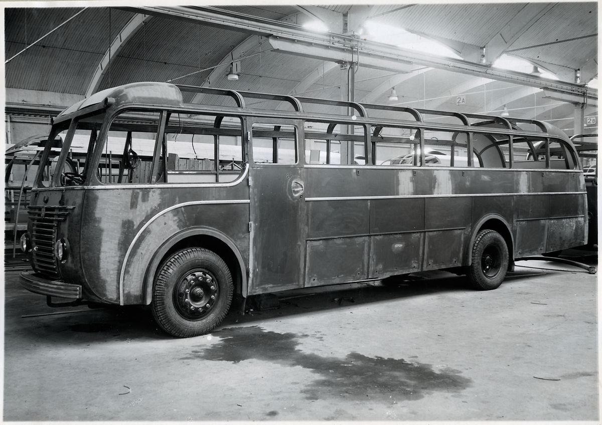 Statens Järnvägars turistbuss under tillverkning hos Svenska Järnvägsverkstäder, ASJ, i Linköping.