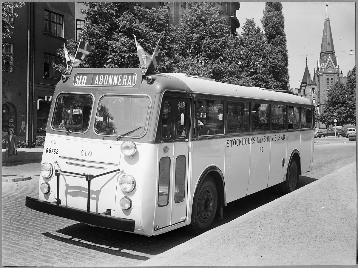 Scania-Vabis "Bulldog". Stockholms Läns Omnibuss AB, SLO. Stockholm-Roslagens Järnväg, SRJ buss 62 stående på Birger Jarlsgatan med S:t Georgios kyrka i bakgrunden.