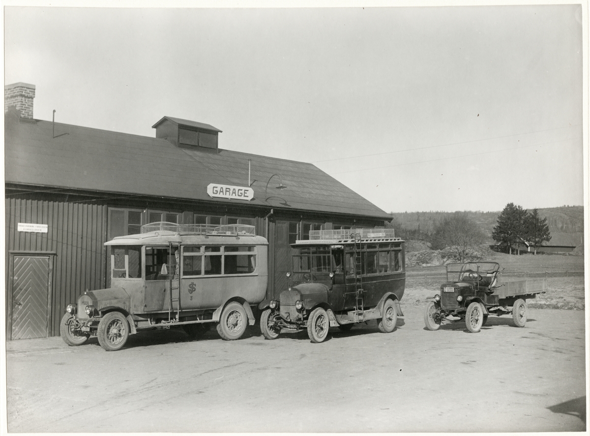Två bussar och en lastbil utanför ett garage i Dingle. Statens Järnvägar, SJ.