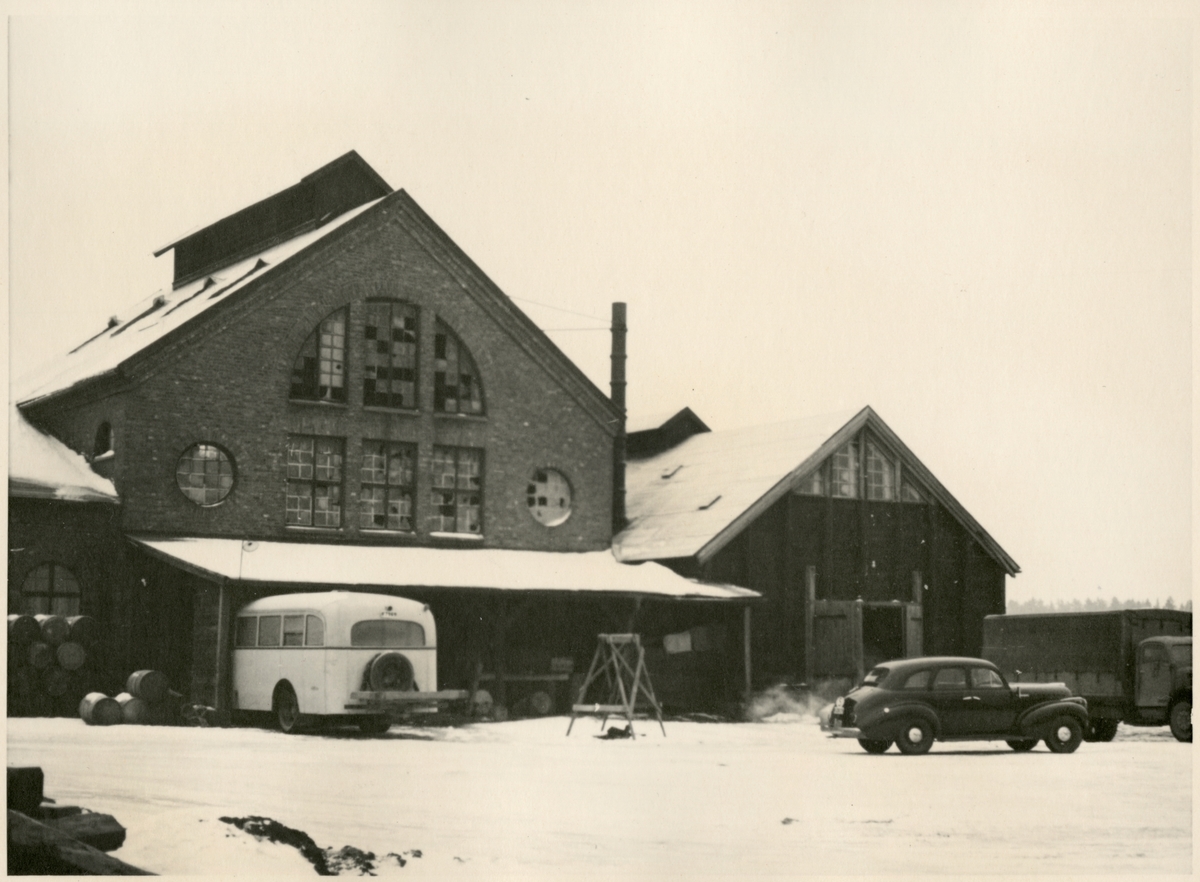Buss, lastbil och bil vid bussgarage och verkstäder i Skara.