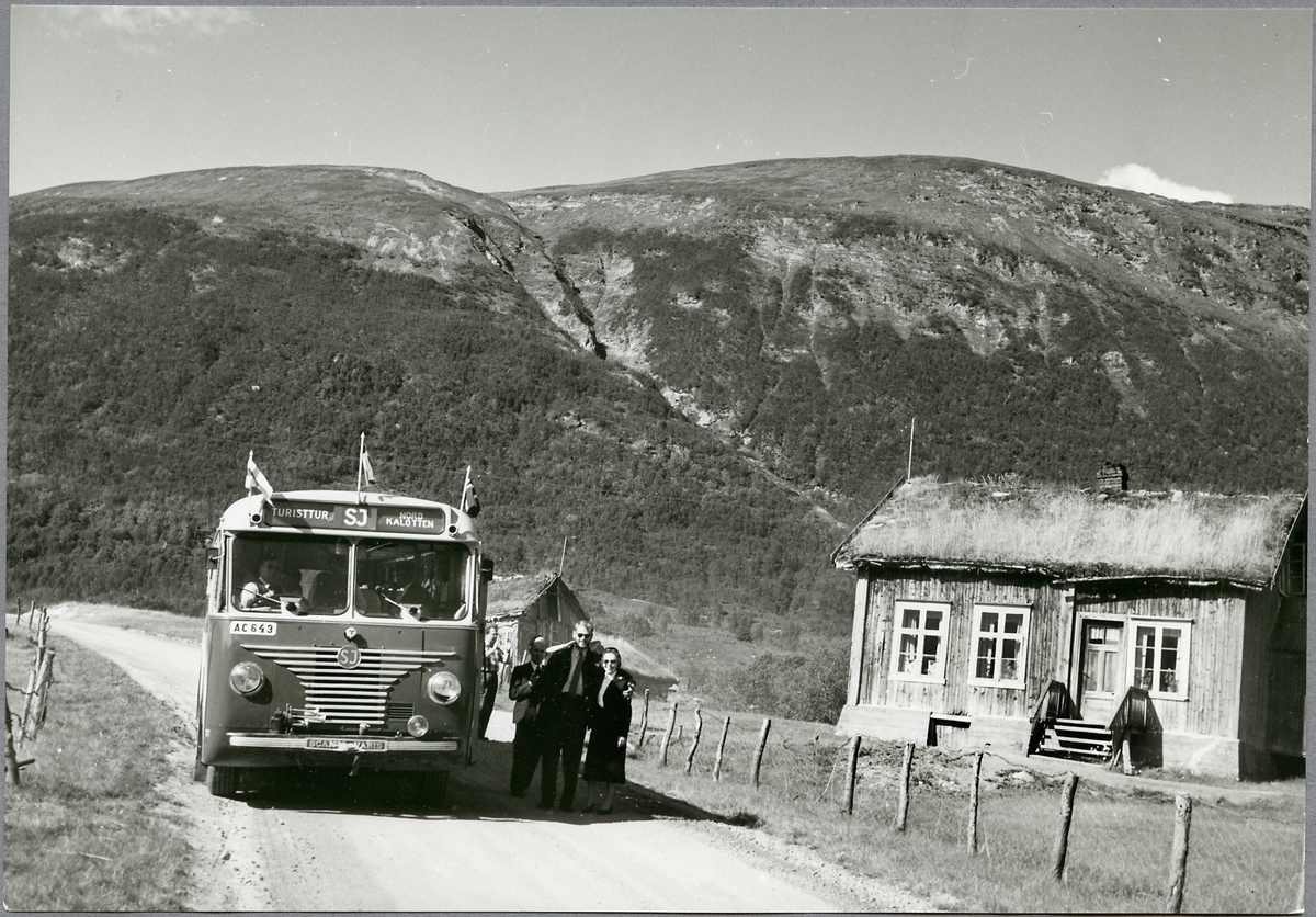 Statens Järnvägar, SJ buss 1877 har stannat vid gammalt hus efter vägen mellan Tromsø och Vollan.