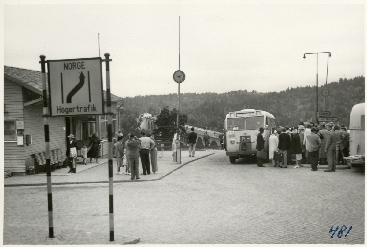 Titel: Busstationen vid Svinesund med resande till och från Norge.