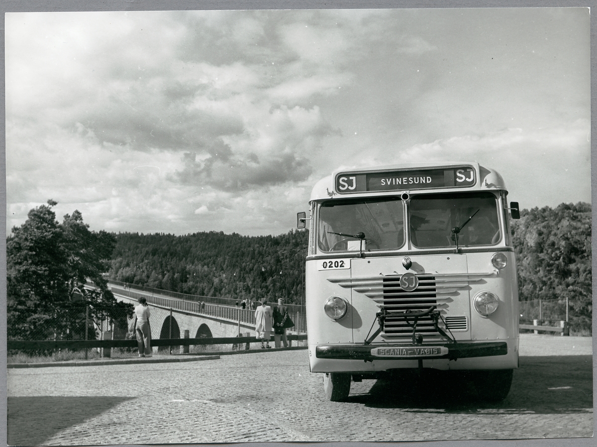 Statens Järnvägar, SJ buss med registreringsnummer O202 vid Svinesundsbron.