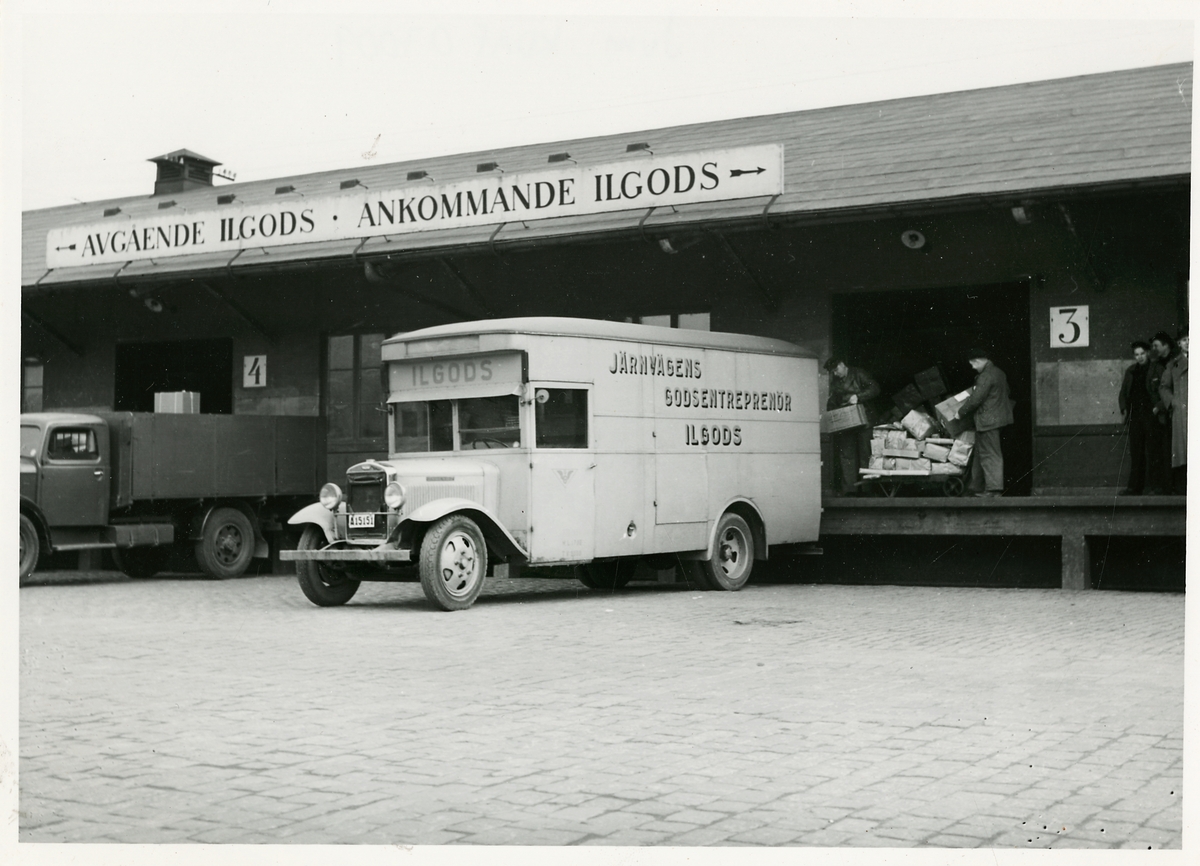 Titel: Lastbil Volvo LV 72 D tillhörande AB Järnvägens Godsentreprenör lastar ilgods på Stockholm Norra.