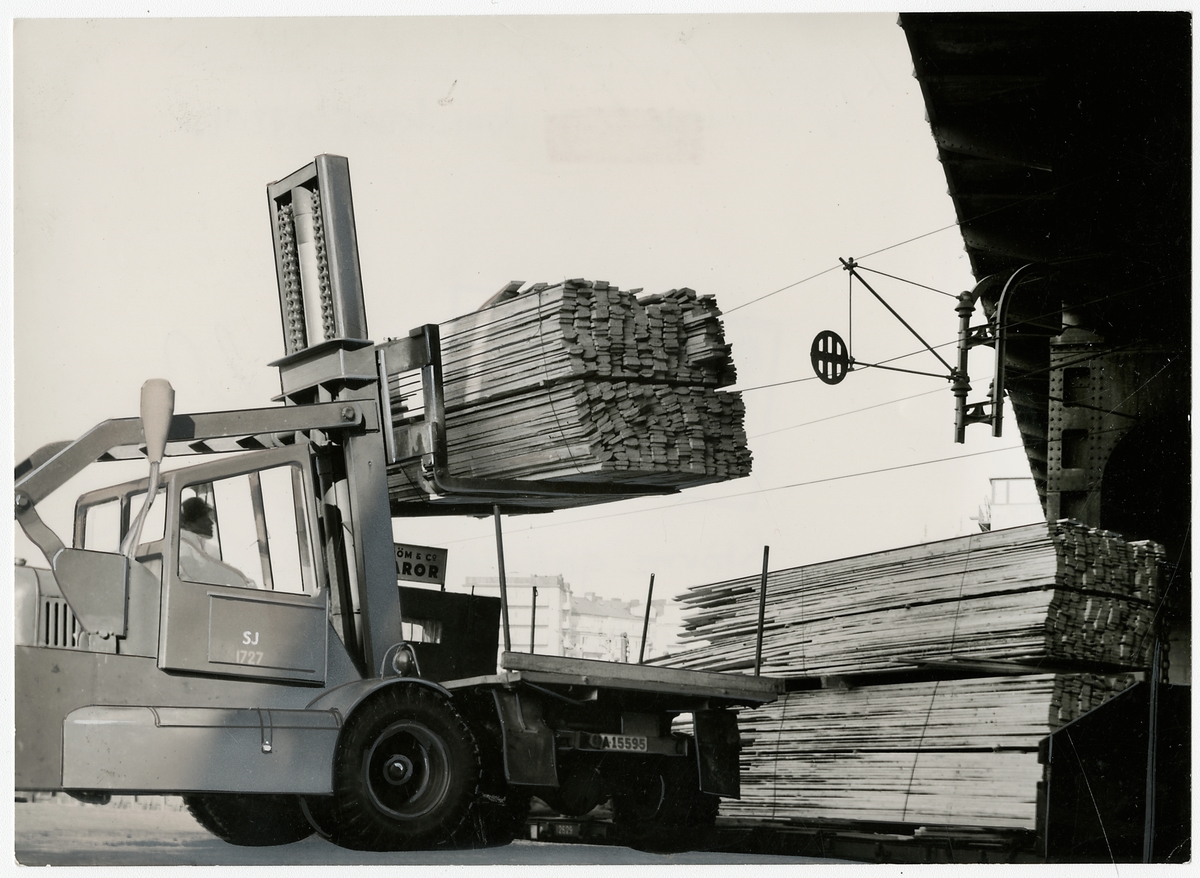 Virkeshantering med truck, Statens Järnvägar, SJ 1727 i Liljeholmen.