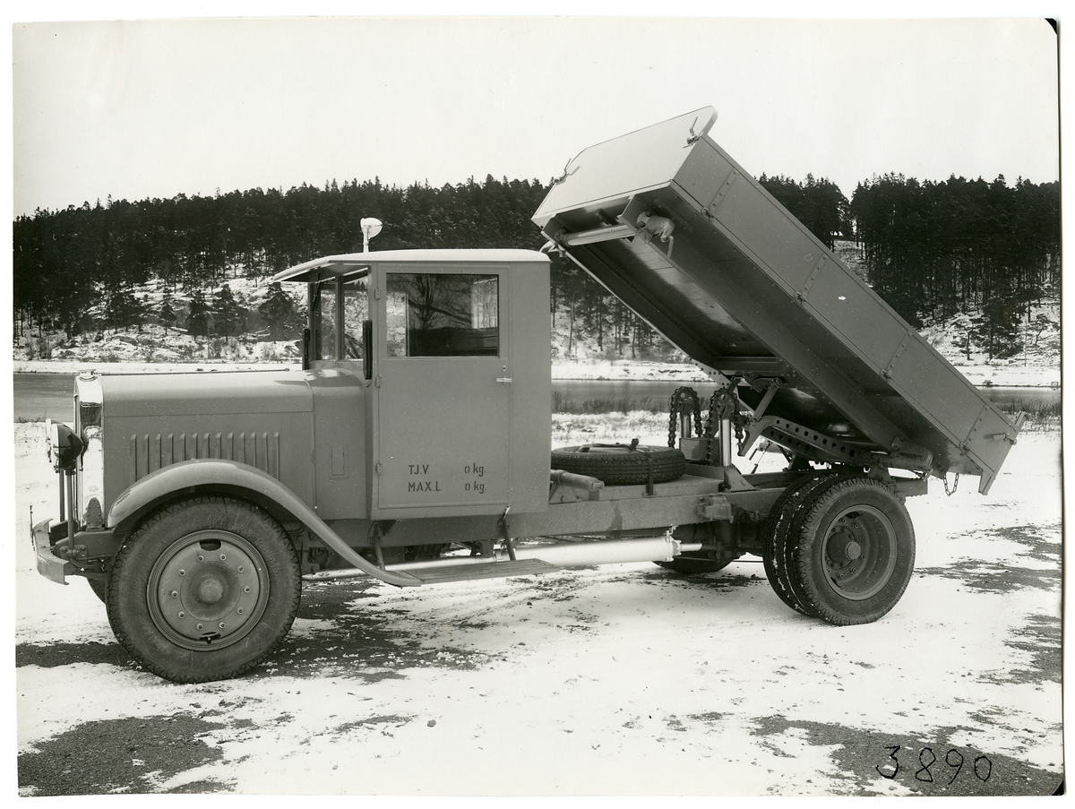 Titel: Scania-Vabis lastbil från 1928 med trevägs hydraultipp.