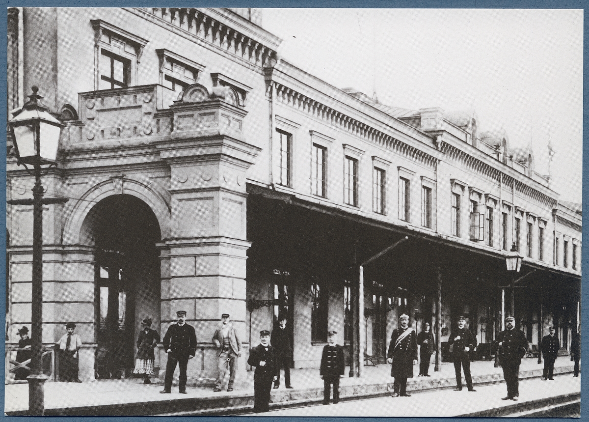 Titel: Järnvägstjänstemän poserar vid Gävle stationshus.