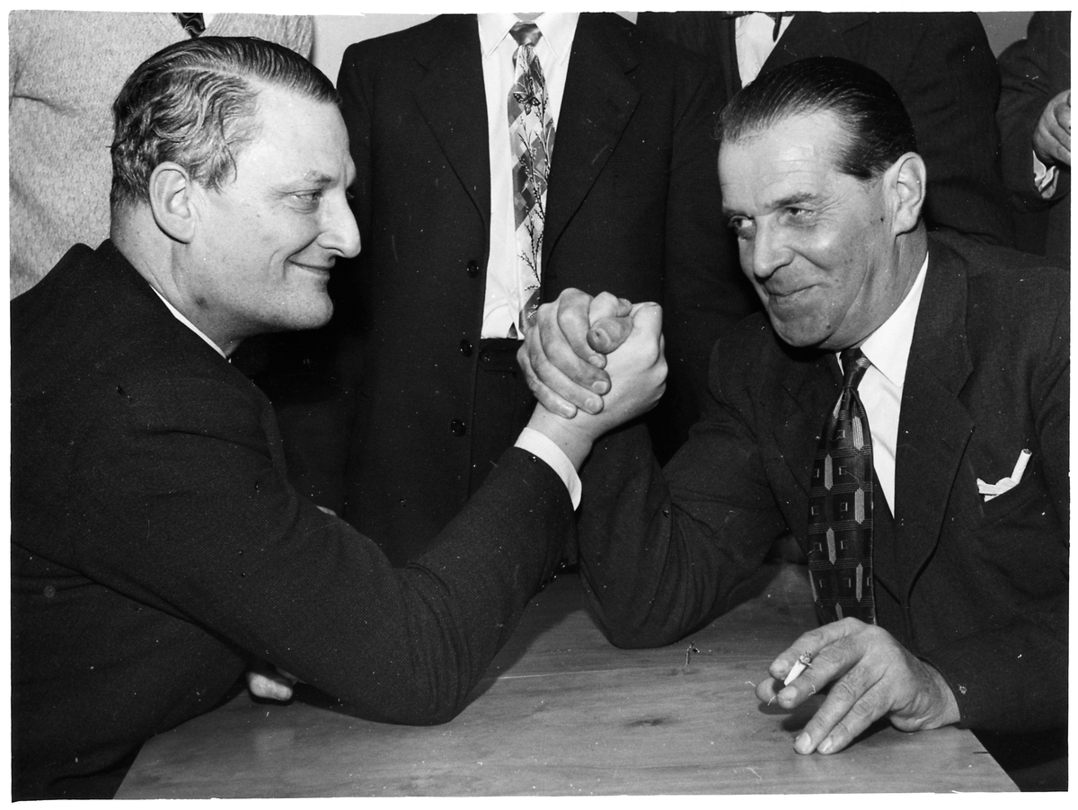 Generaldirektör Erik Upmark bryter arm med banarbetare i Bokehill, Älmhult.