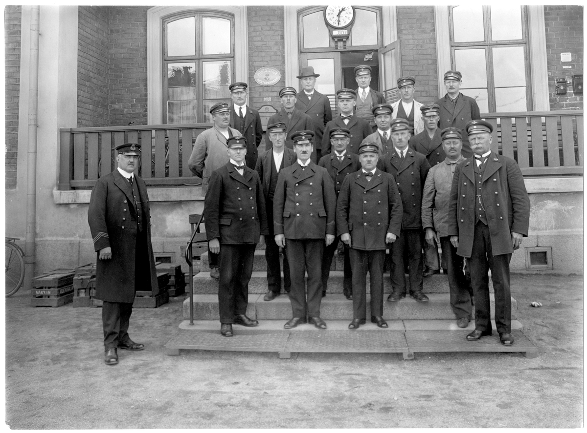 Personal vid Statens Järnvägar, SJ framför stationshuset i Värtan.