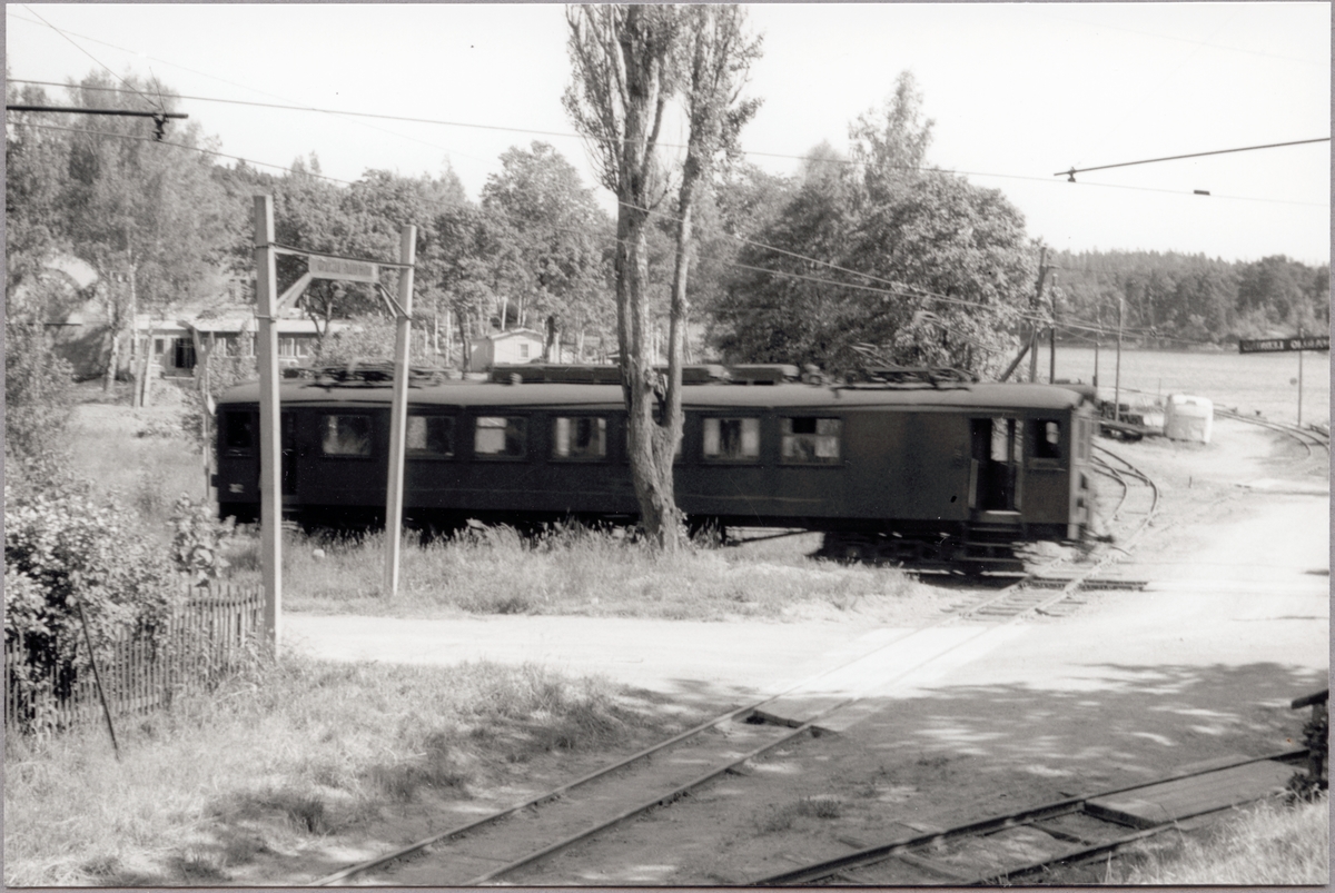 Statens Järnvägar, SJ Xoa2p 32 har passerat järnvägskorsning i Stocksund.