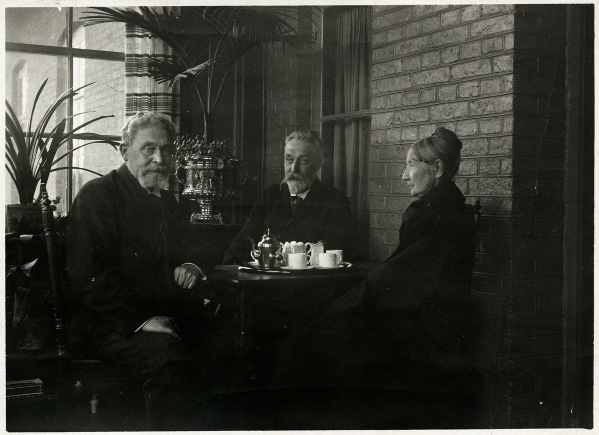 Titel: Trafikinspektör Rydbeck och Huvudkassör Torell dricker kaffe med okänd kvinna.