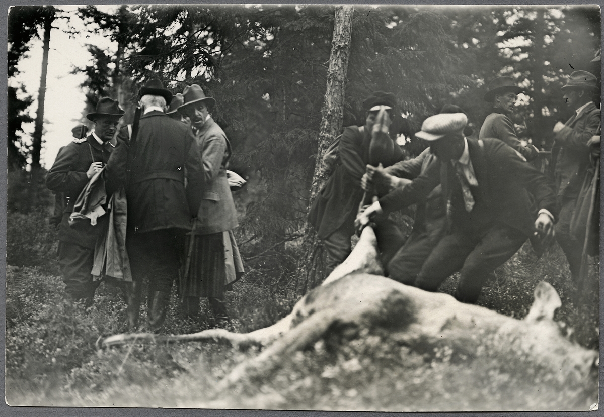 Titel: Konung Alfons XIII av spanien och Konung Gustaf V med jaktsällskapet under älgakten.