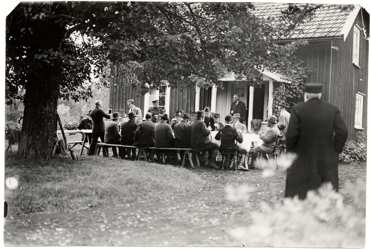 Titel: Konung Gustaf V och Konung Alfons XIII jaktsällskap lunchar på Kronojägarebostad på Fagerhult i Hunneberg.
