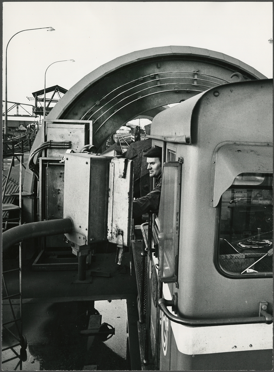 Lokföraren Olle Pettersson i arbete vid vagnvändaren i Oxelösunds hamn.
