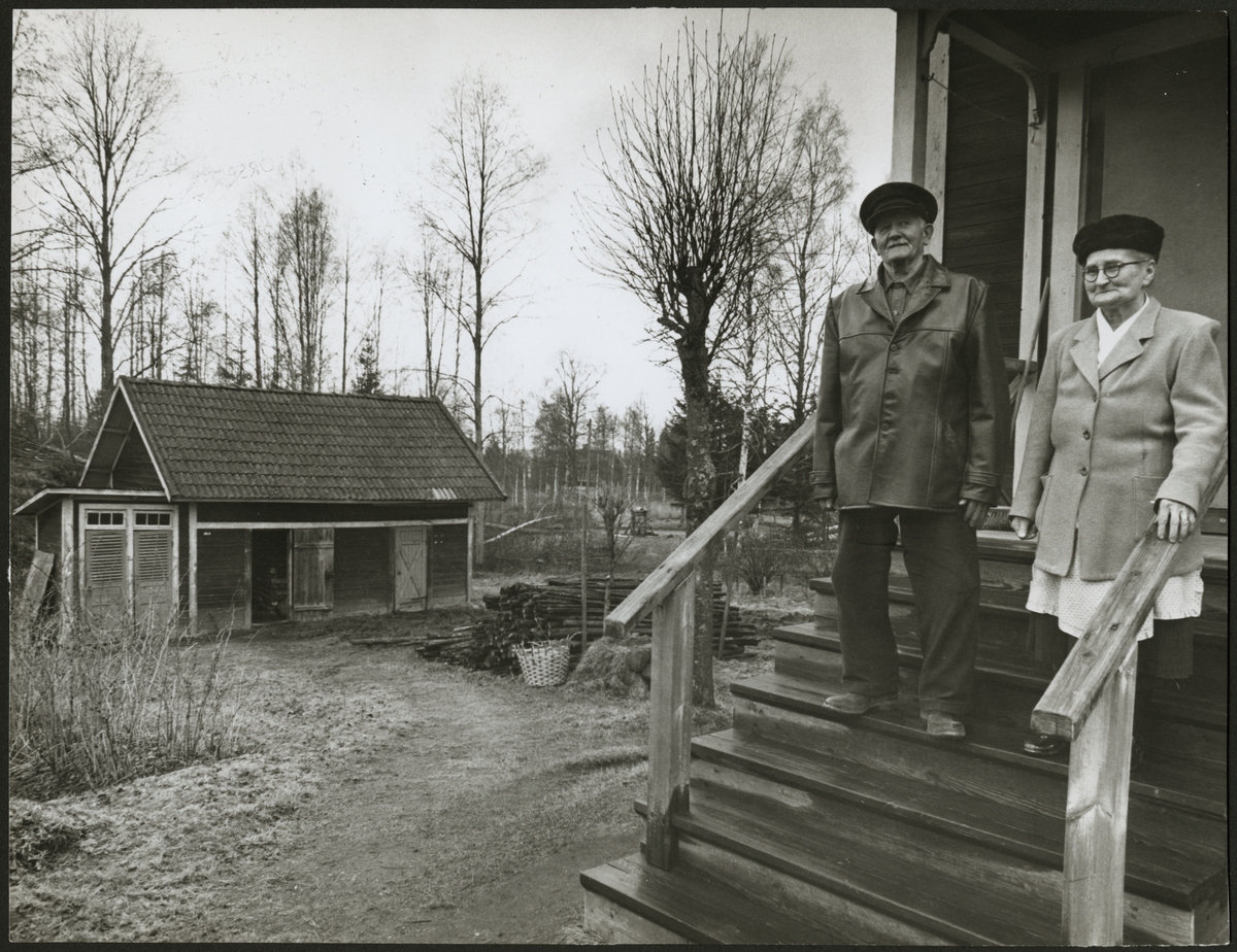 Äldre par står utanför hus mellan Storå och Stråssa 1958.