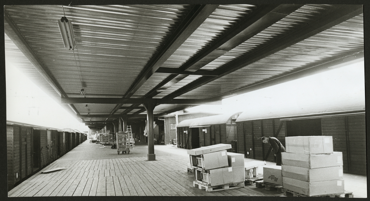 Titel: Godsvagnar och gods på takförsedd lastbrygga 1963.