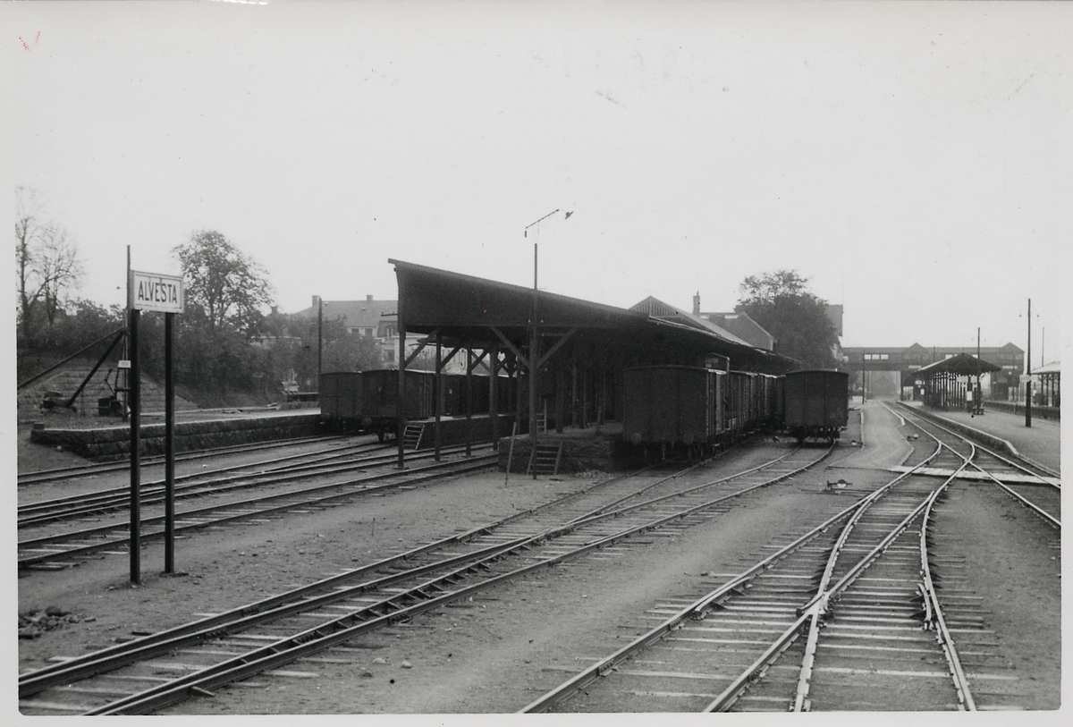 Alvesta bangård, där stationshuset syns skymta i bortre änden av godsmagasinet.