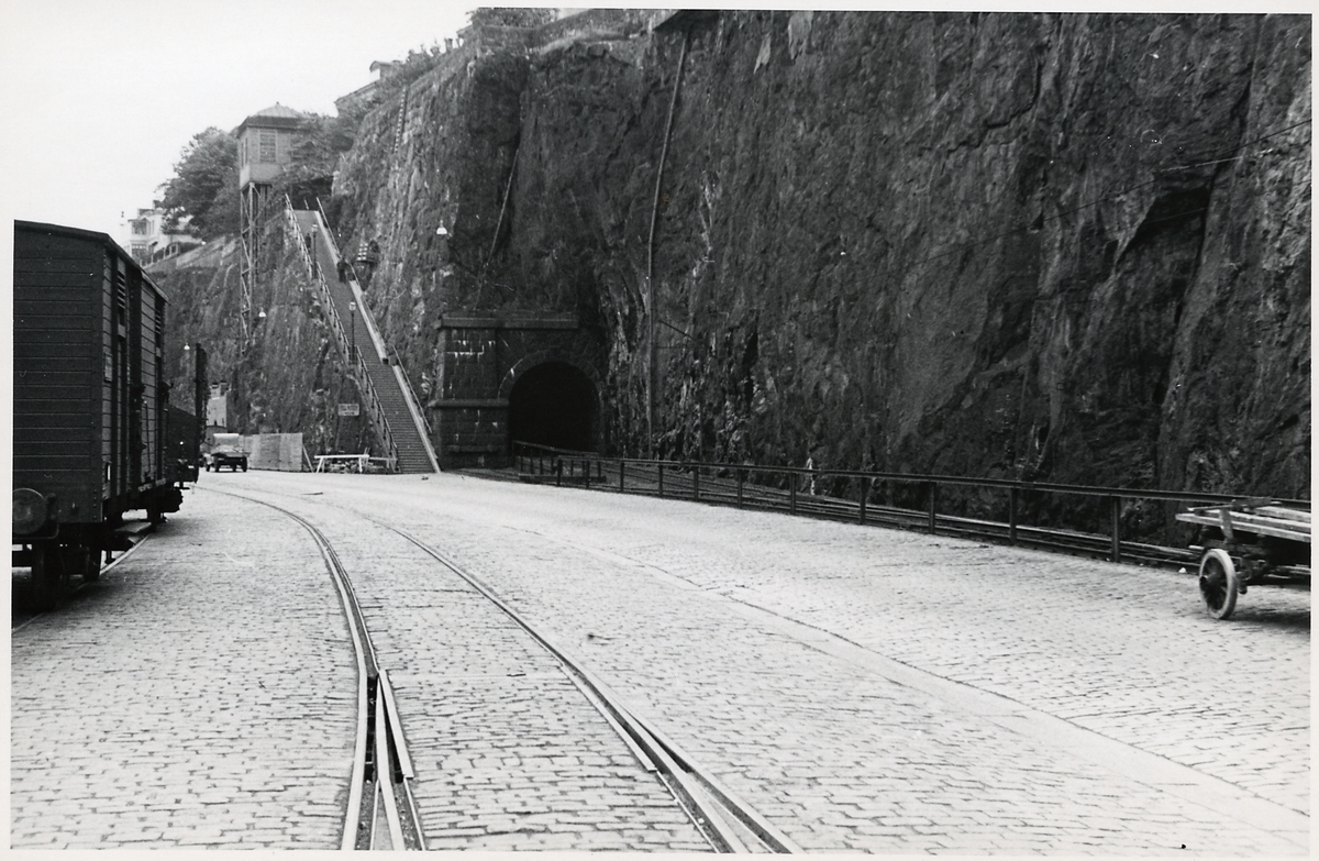 Stadsgårdshissen. Tunnelöppningen till höger om trappan tillhör "Saltsjöbanan" SSnJ, Stockholm Saltsjöbanan. Hamnspåret i bild tillhör Statens Järnvägar SJ.