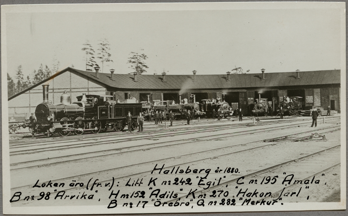 Lok från vänster Statens Järnvägar, SJ K 242 "Egil", SJ C 195 "Amala", SJ B 98 "Arvika", SJ H 152 "Adils", SJ K 270 "Hakon Jarl", SJ B 17 "Örebro", SJ Q 282 "Merkur".