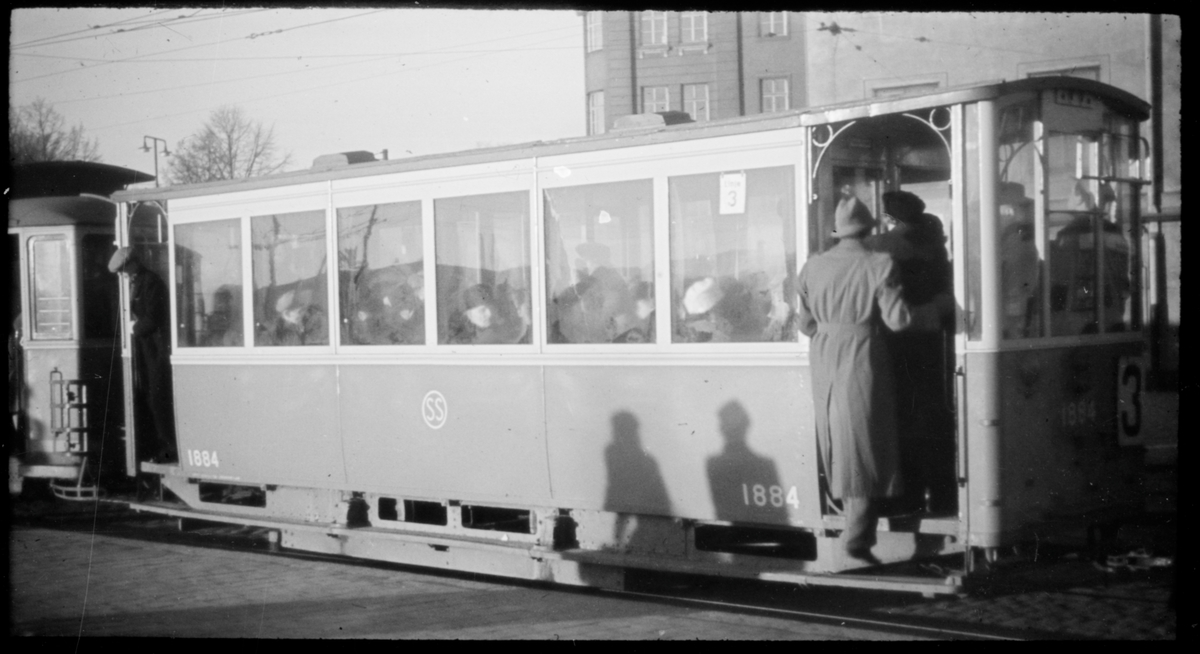 Aktiebolaget Stockholms Spårvägar, SS C7 (II) 1884 "masonitvagn" vid hållplats på linje 3 Haga - Slussen - Hornstull.