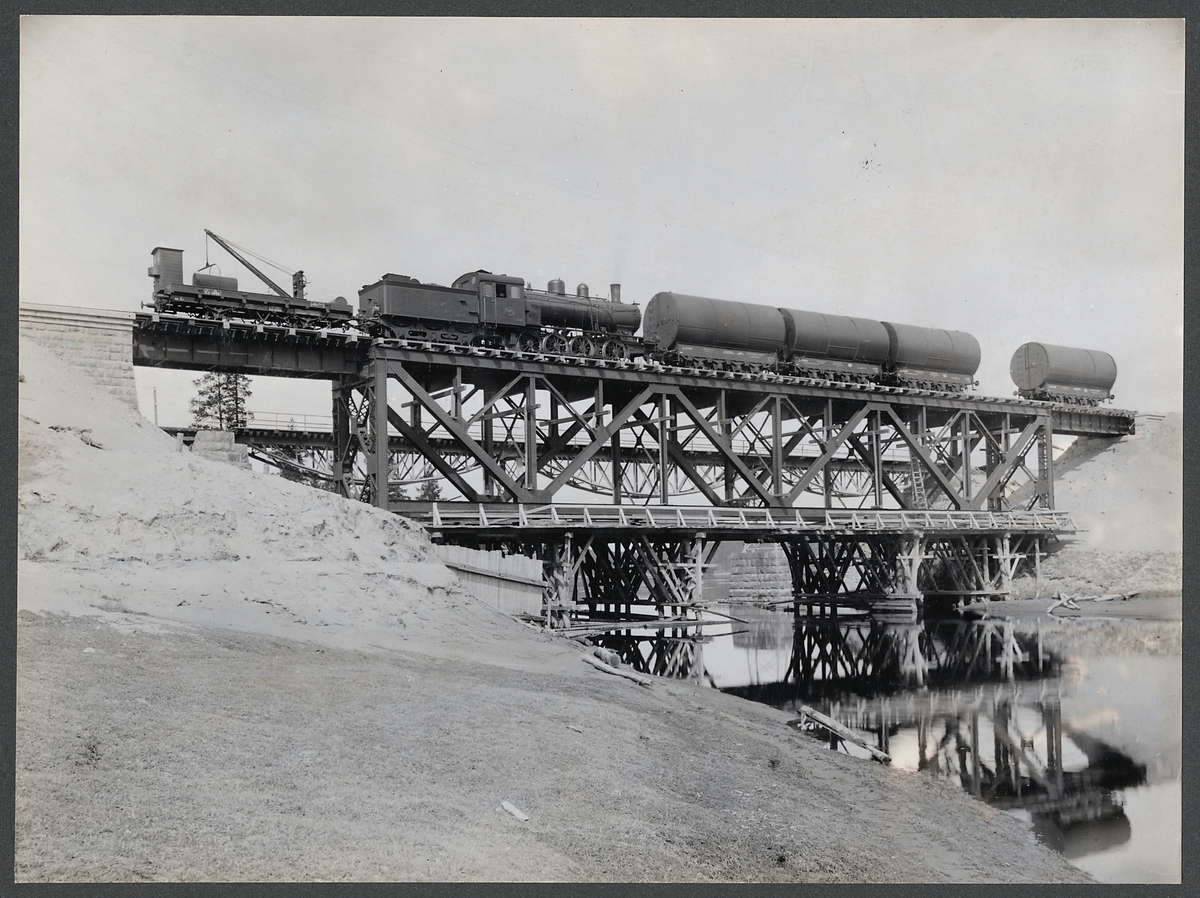 Provbelastning av järnvägsbron över Petikån med Statens Järnvägar, SJ E2 949 och godsvagn SJ Cf 1050 och SJ Q.