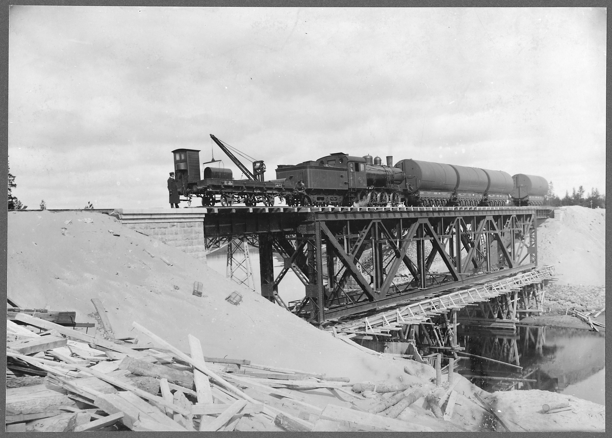 Provbelastning av järnvägsbron över Petikån med Statens Järnvägar, SJ E2 949 och godsvagn SJ Cf 1050 och SJ Q.
