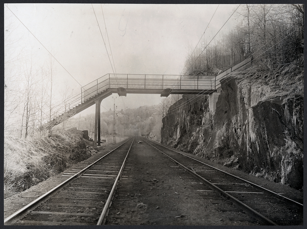 Titel: Gångbron vid Stålebo. Gångbro på linjen mellan Jonsered och Lerum.