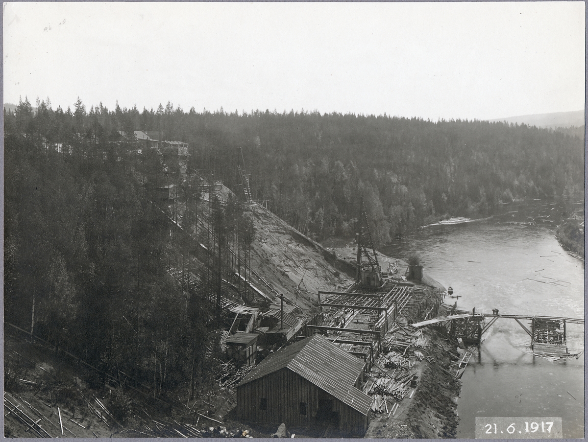 Broläget den 21 juni 1917 visande betongformarna för pelarna I, II o III samt den efter branden i maj delvis rivna pålverkstaden vid Öreälven.