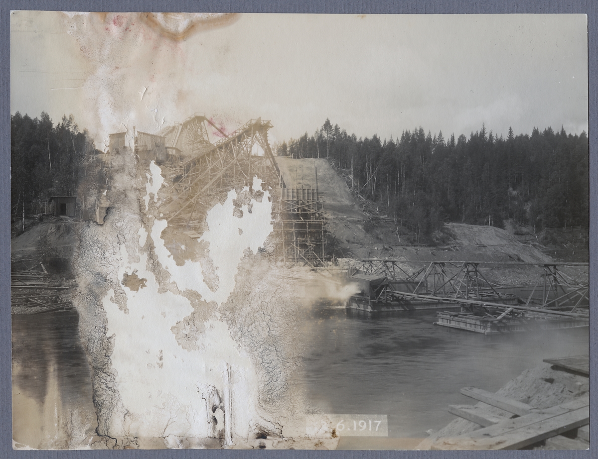 Bygge av järnvägsbro över Öreälv. Transportbanan för betongtillförsel till pelarna. Länsning i ställningsfundament.