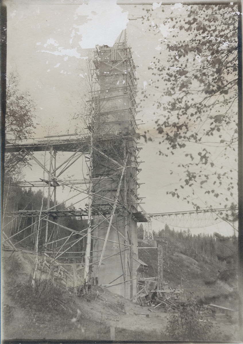 Titel: Bygge av järnvägsbro över Öreälv. Pelare sedd från nedströmssidan.