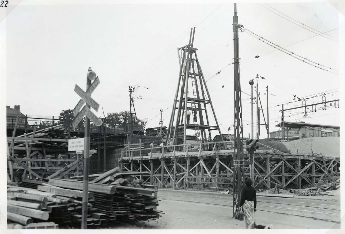 Titel: Byggnationen av ny järnvägsviadukt över Norrtullsgatan. Pålning för västra landfästet i norra brodelen.