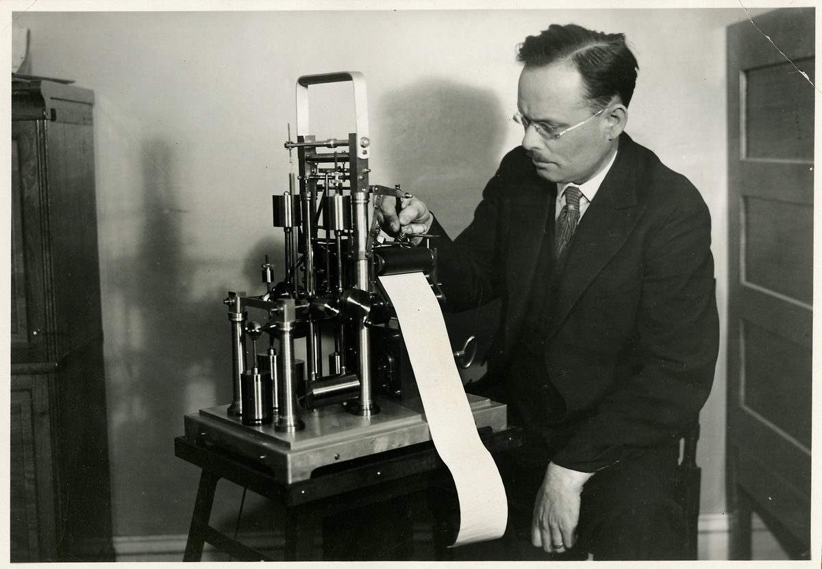 Byrådirektör Pramberg vid Hallade apparat, som är ett mätinstrument som kan monteras i en järnvägsvagn för att upptäcka och kontrollera spårfel, och även jämföra olika vagnars gångegenskaper.