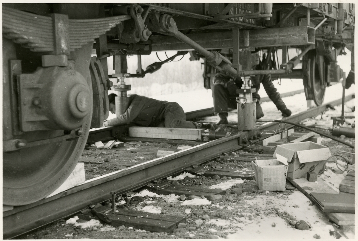 Banarbete efter urspårning av tåg 93, Nordpilen, på sträckan mellan Simeå och Undersvik 1956-03-27.