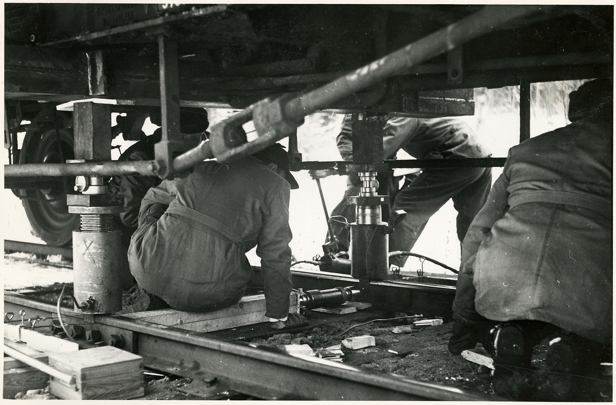 Titel: Banarbete efter urspårning av tåg 93, Nordpilen, på sträckan mellan Simeå och Undersvik 1956-03-27.