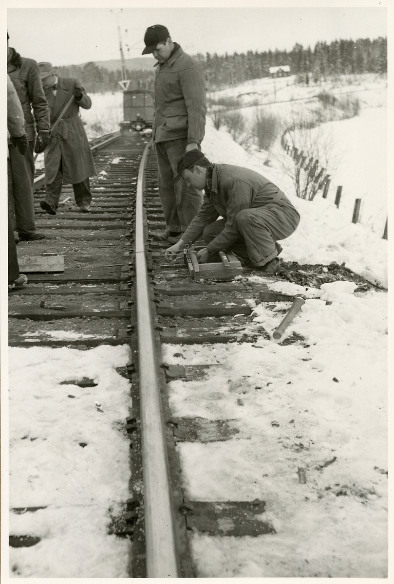 Banarbete efter urspårning av tåg 93, Nordpilen, på sträckan mellan Simeå och Undersvik 1956-03-27.