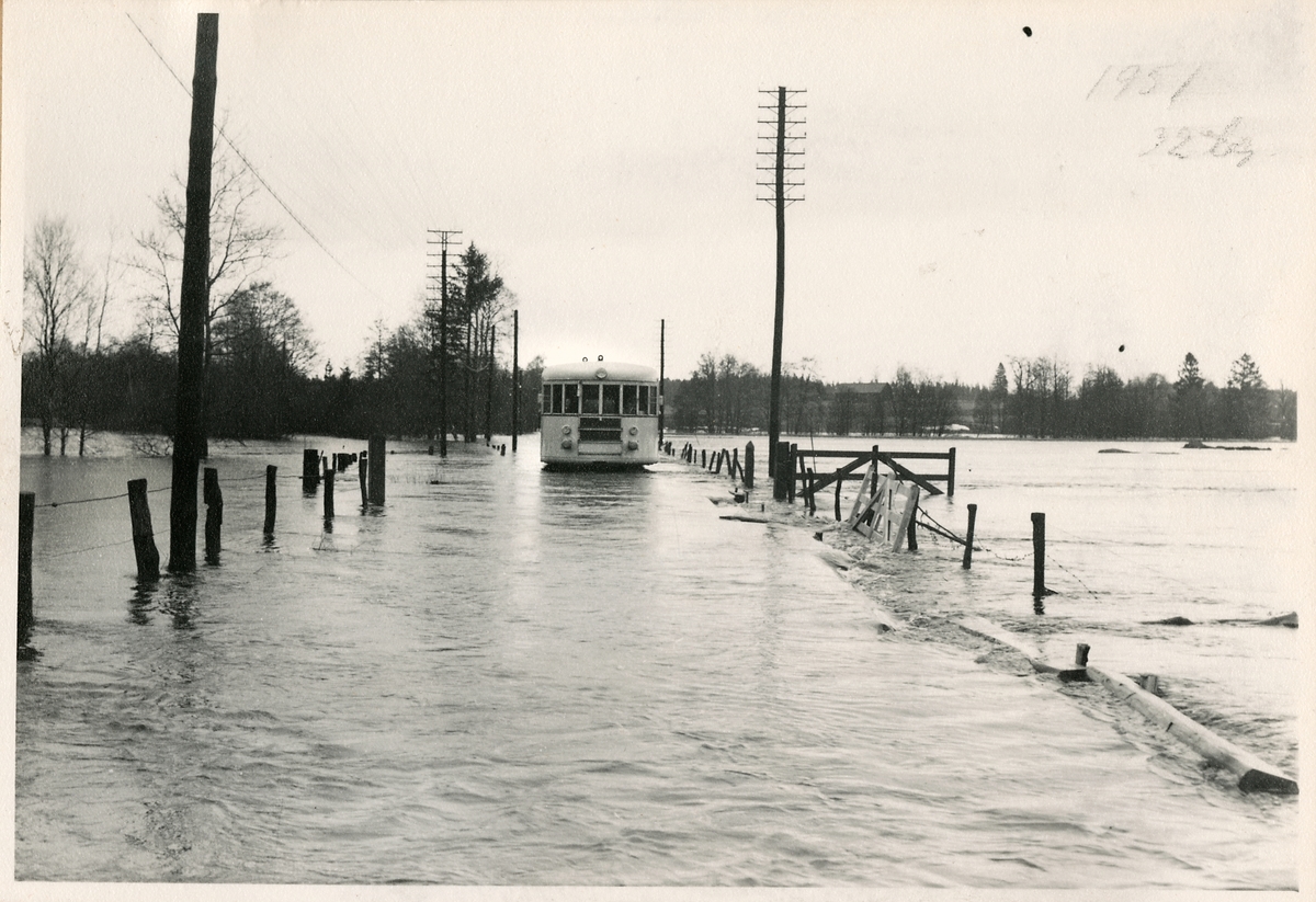 Titel: Motorvagn vid översvämningen i Halmstad 1951.