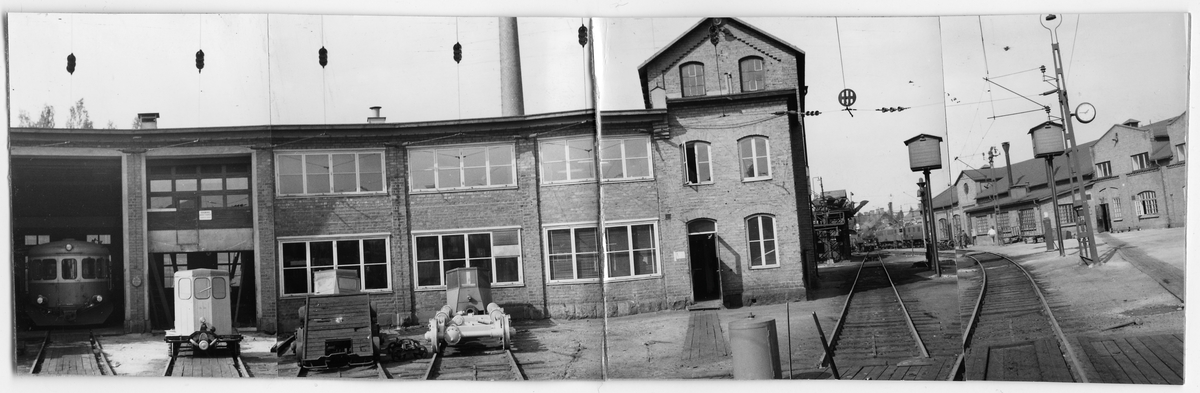 Titel: Rälsbuss i lokstallet. Dressiner med vindsskydd utanför.