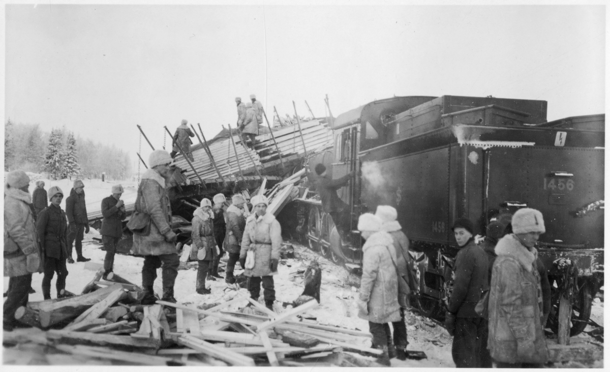 Personal samt godsvagn och ånglok med tender vid järnvägsolycka.