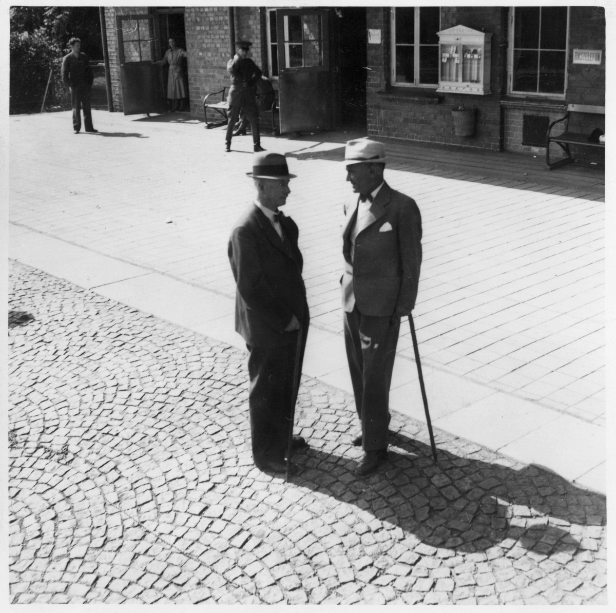 Män utanför stationshus.